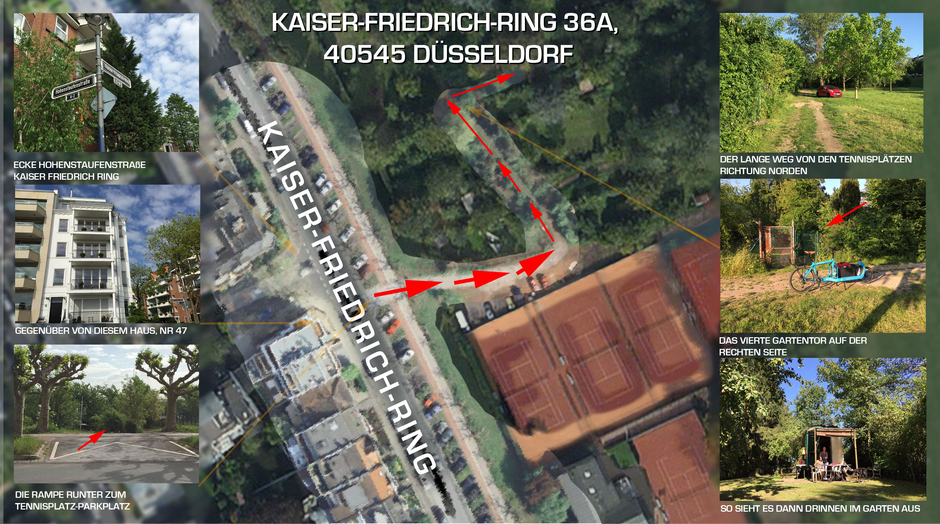 Ich nehme schlicht an, dass der Weg nach Düsseldorf Oberkassel keine Schwierigkeit darstellt. Im Prinzip lautet diese Beschreibung: Milchstrasse, Erde, Europa, Deutschland, Nordrhein-Westfalen, Düsseldorf, Oberkassel, Kaiser-Friedrich-Ring, dann rechts die Einfahrt zum Tennisplatz runter (Parken!) den schmalen Weg paralell zum Deich entlang laufen, das vierte (kleine grüne) Gartentor auf der rechten Seite.
